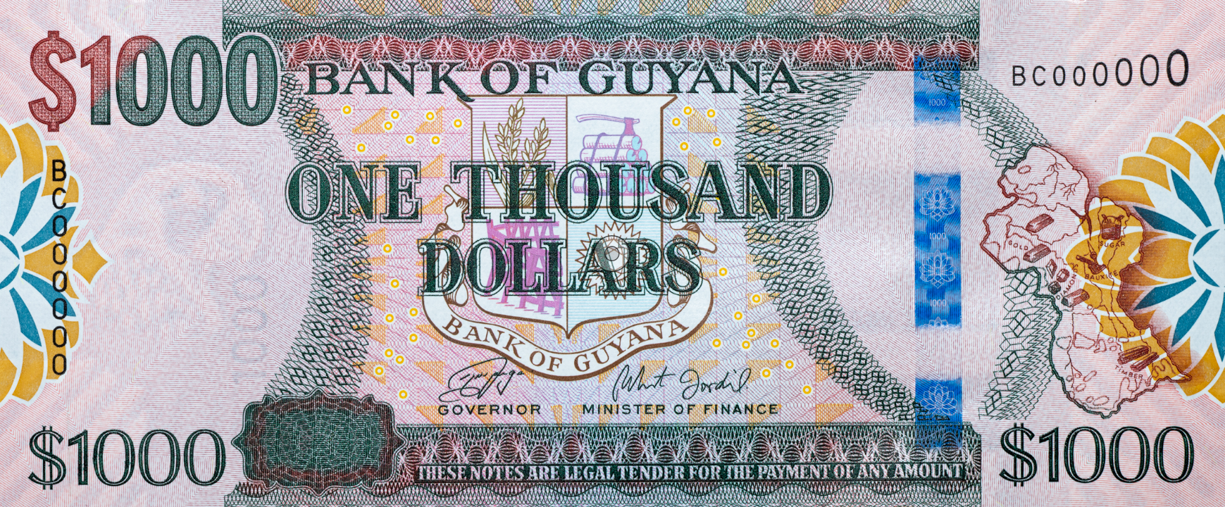 The current series of banknotes in Guyana include 20, 50, 100, 500, 1,000 and 5,000 Guyana Dollars. A total of 14,3 million 1,000 dollar banknotes are currently in circulation, including the old series that soon will be taken out.