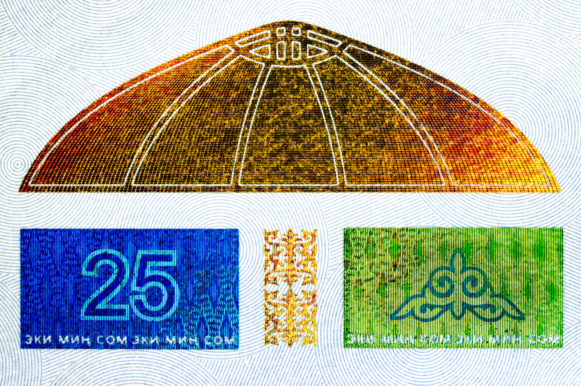 A KINEGRAM COLOR® patch changes the figure “25” to the Kyrgyz national pattern. This security feature incorporates diffractive elements in different colors within a partially demetallized foil. This means that the public sees the KINEGRAM image in multiple colors.