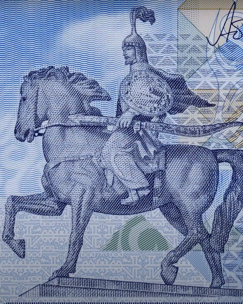 The banknote depicts growth of the Kyrgyz nation from ancient times to the present day. The main plot of the design is the monument of the national hero “Manas” who united the Kyrgyz tribes and the quote from the epos of “Manas” that says: