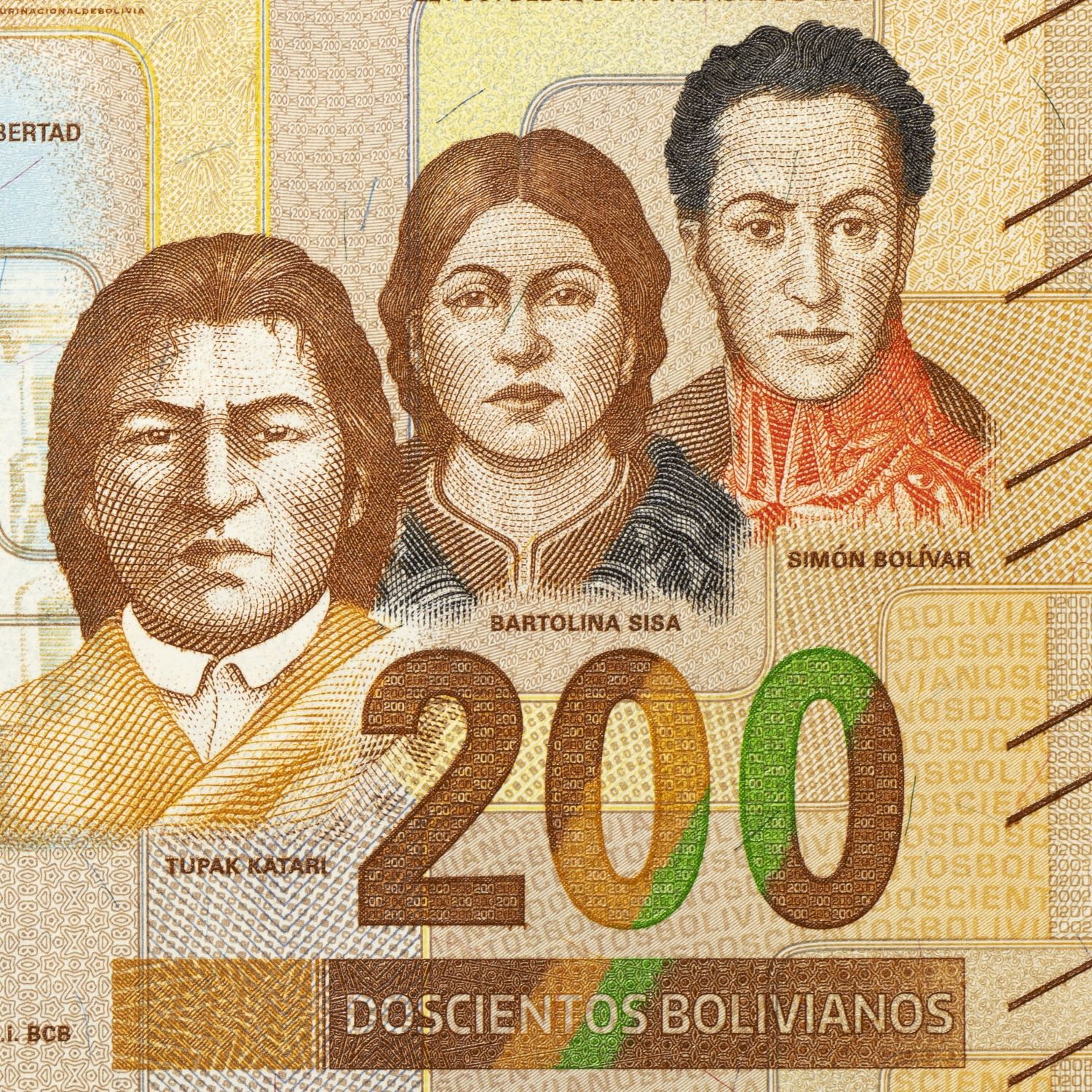 The main characteristic of the new banknote is that it includes two leaders of the rebellion of 1780-1782, Tupak Katari (Julián Apaza) and Bartolina Sisa, and the Liberator Simón Bolívar.