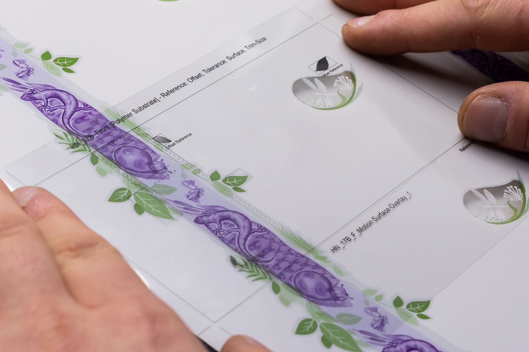 “The application of MOTION SURFACE differs across substrates. On paper, we could print offset beneath the feature for a smooth color transition. On polymer, we couldn’t print below the stripe, and the available substrate colors were limited to two. That meant we had to simplify certain details, like removing the ladybug and the fine leaf structure from the polymer note.”