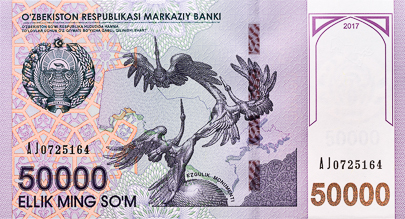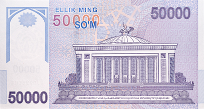 The Central Bank of Uzbekistan has issued a new banknote, the 50,000 Som. The design on the front of the banknote features the top of the Ezgulik Arch on Independence Square in the city of Tashkent.