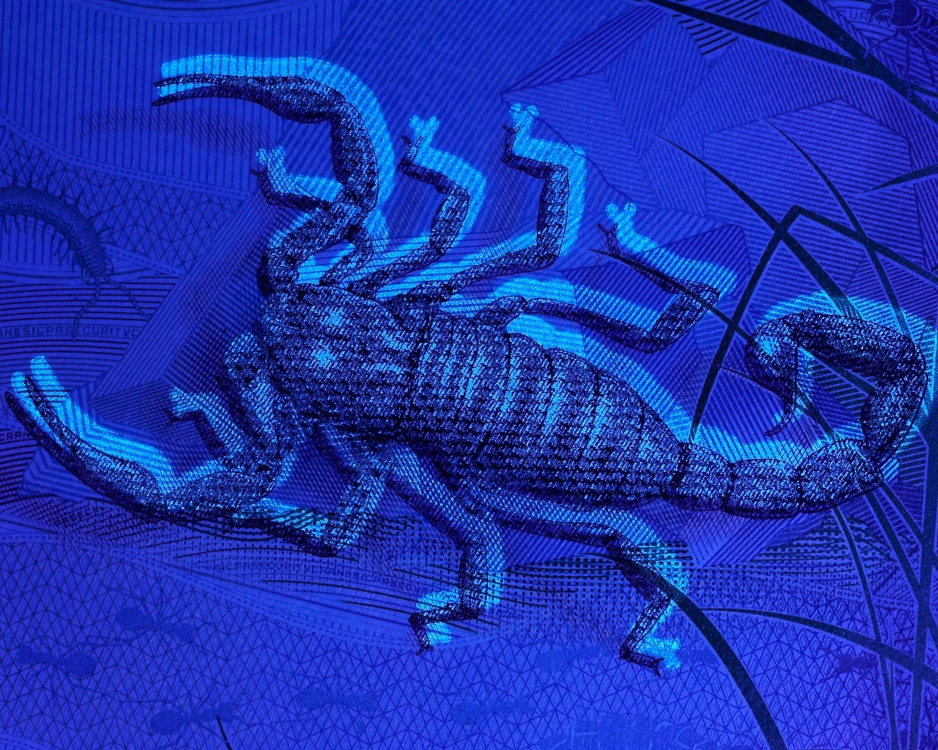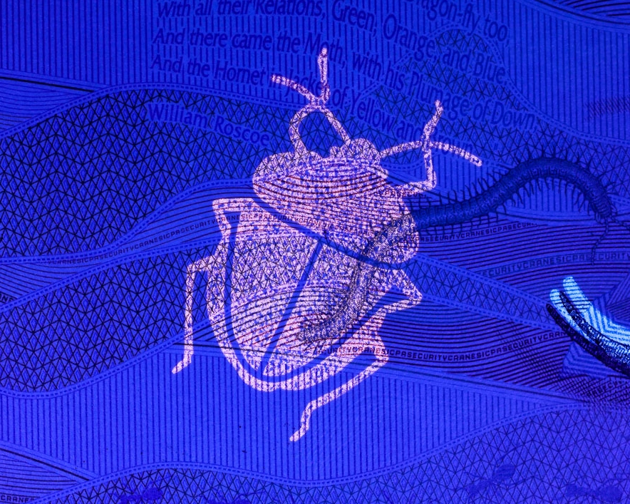 3D Topo Effects – a snail’s shell and salamander provide bold 3D visual cues, seeming to rise out of the note, and contrast with a red intaglio printed ladybug