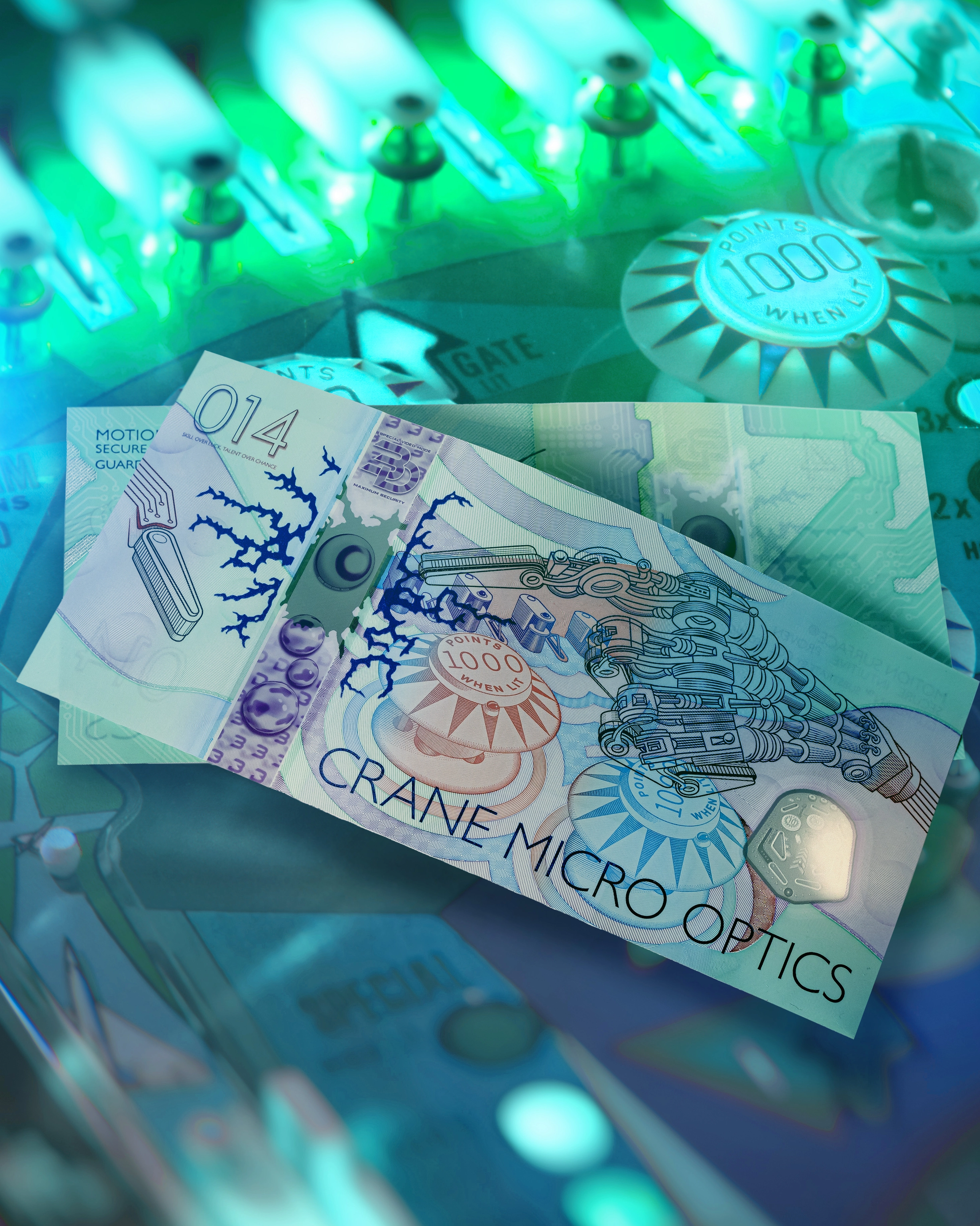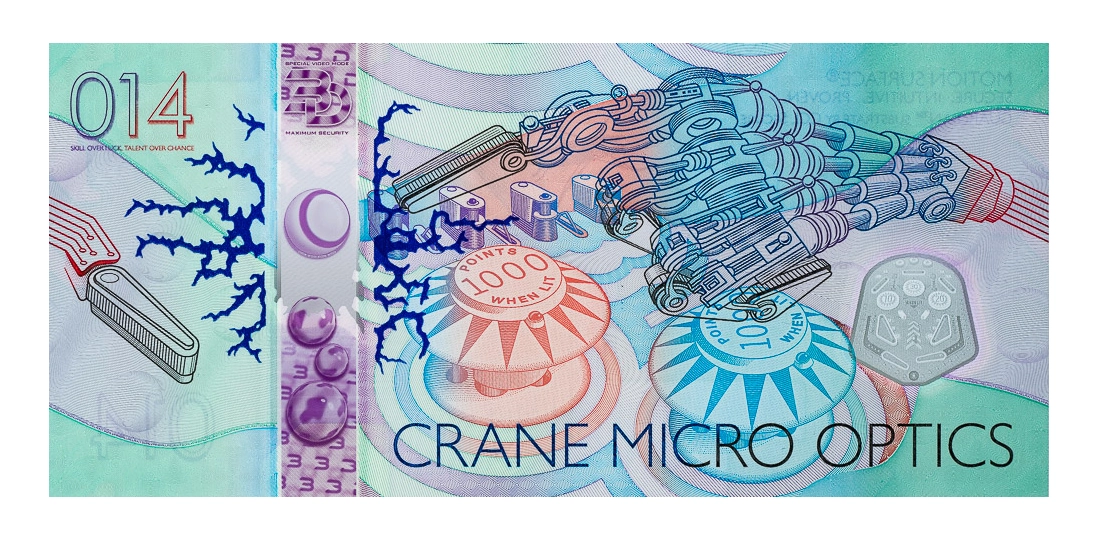 The Pinball Note uses a 12 mm wide MOTION SURFACE® micro-optic stripe designed to secure polymer banknotes.
