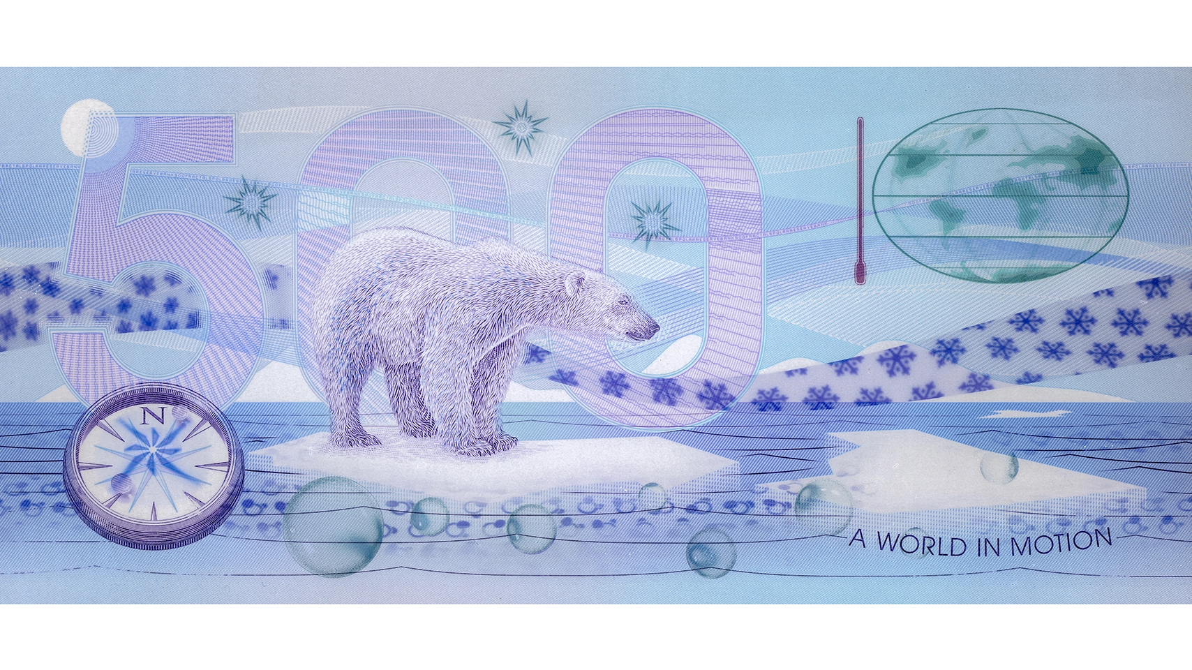 On the reverse of the note, the North Pole provides storytelling with movement. The Topo feature and compass effect tie themes on the front of the note to the back. Topo bubbles are rendered in a different colour from their surrounding micro-optic effects. This heightens contrast and enforces the separation of their above-the-surface feeling from the dynamic Deep water molecule icons below.