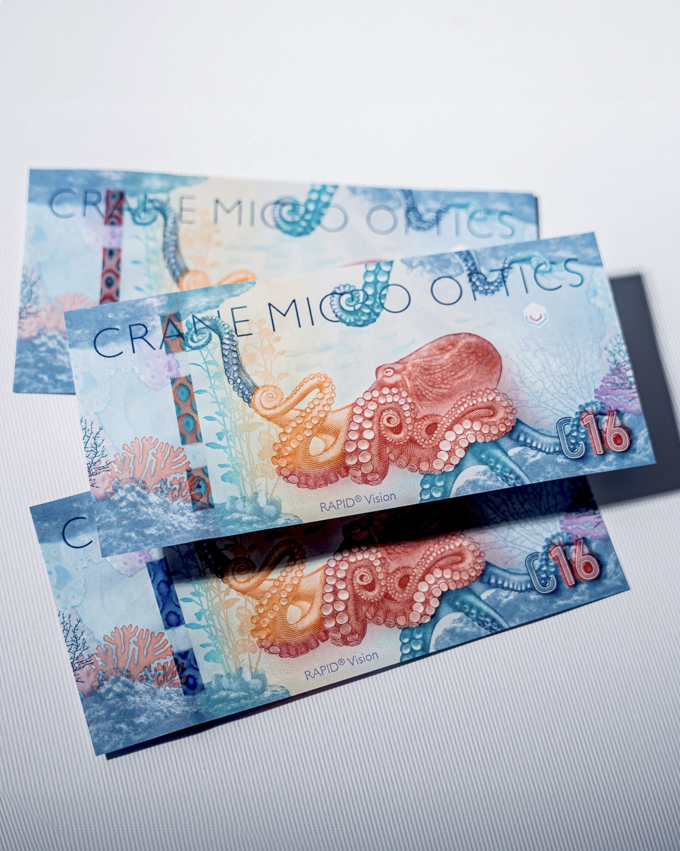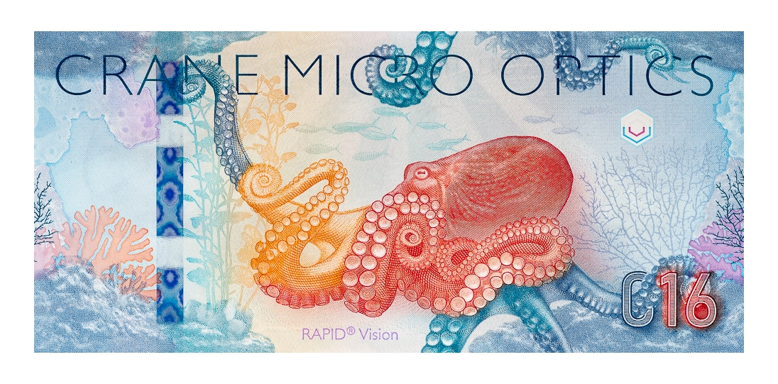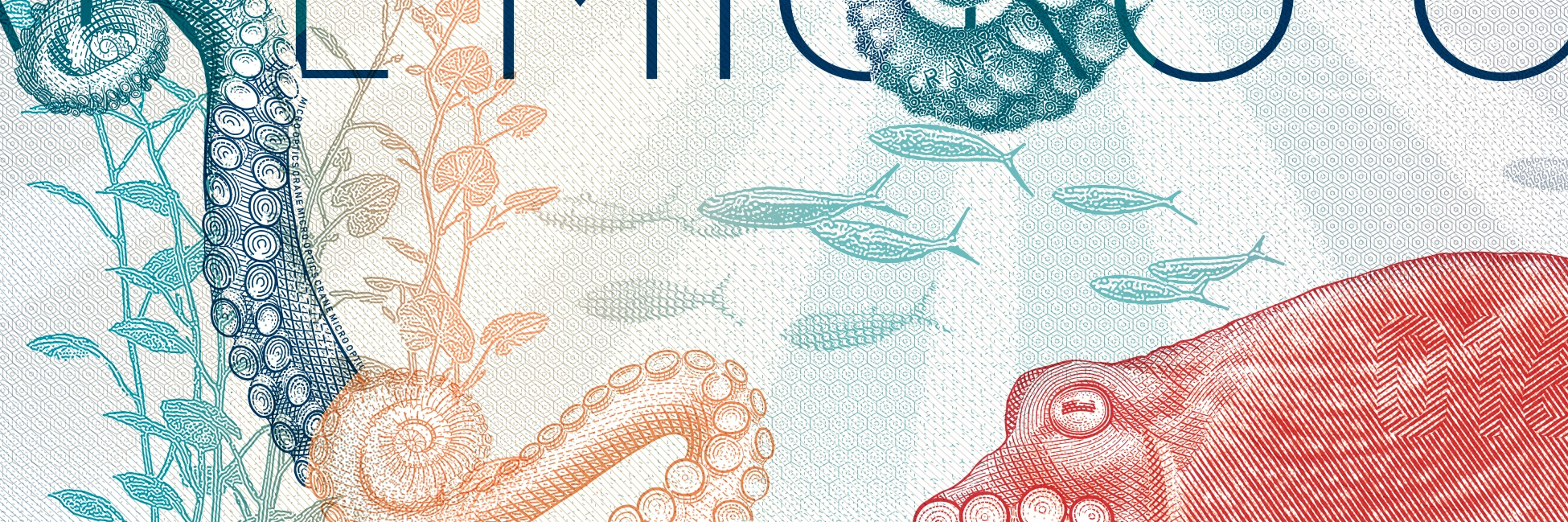 The theme of the note is adaptation, which centers on a giant Pacific octopus. Modern, customizable security features increase security by making intuitive connections to a banknote’s theme. In this case, the note’s designers created a multicolor RAPID Vision security thread evocative of the octopus’ ability to change color and texture.