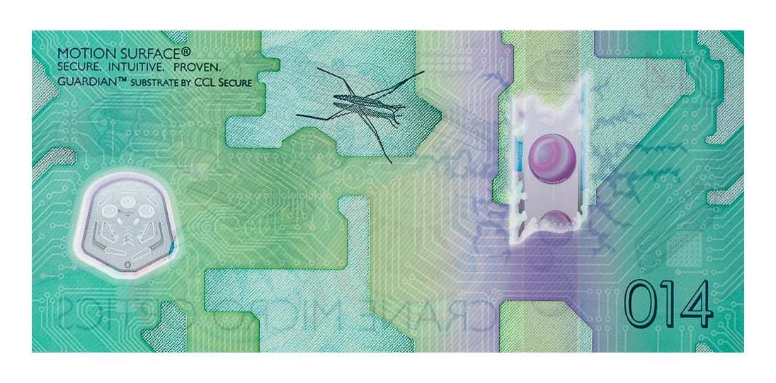 The Bug Note was designed to introduce another industry first, a machine-readable RAPID® micro-optic security thread which includes an invisible near IR-absorbing material that produces unique responses at different wavelengths. It is easily interrogated with sensors that today exist in most banknote equipment, from those used at POS to the high-speed processing equipment employed by central banks.