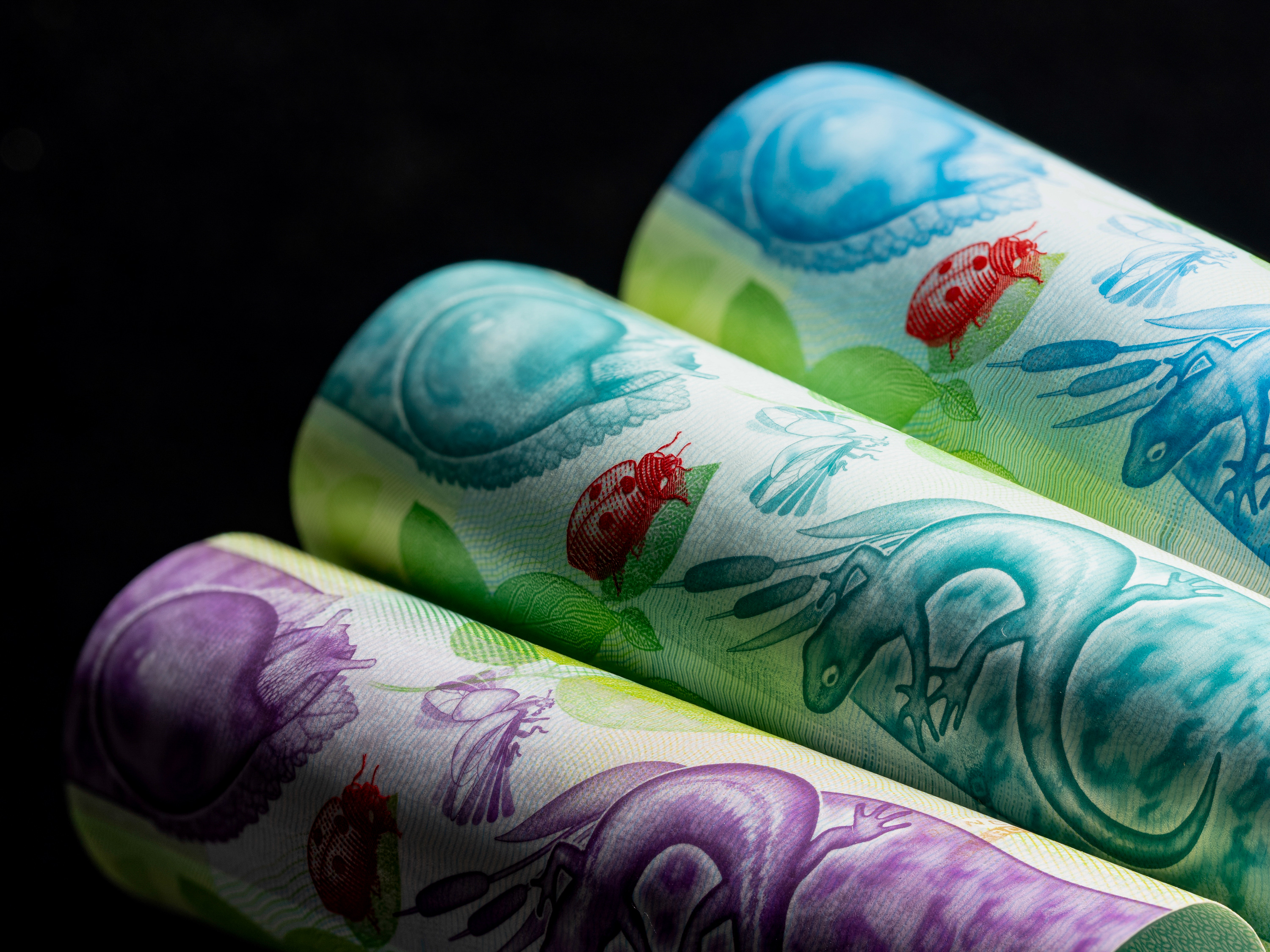 3D Topo Effects – a snail’s shell and salamander provide bold 3D visual cues, seeming to rise out of the note, and contrast with a red intaglio printed ladybug
