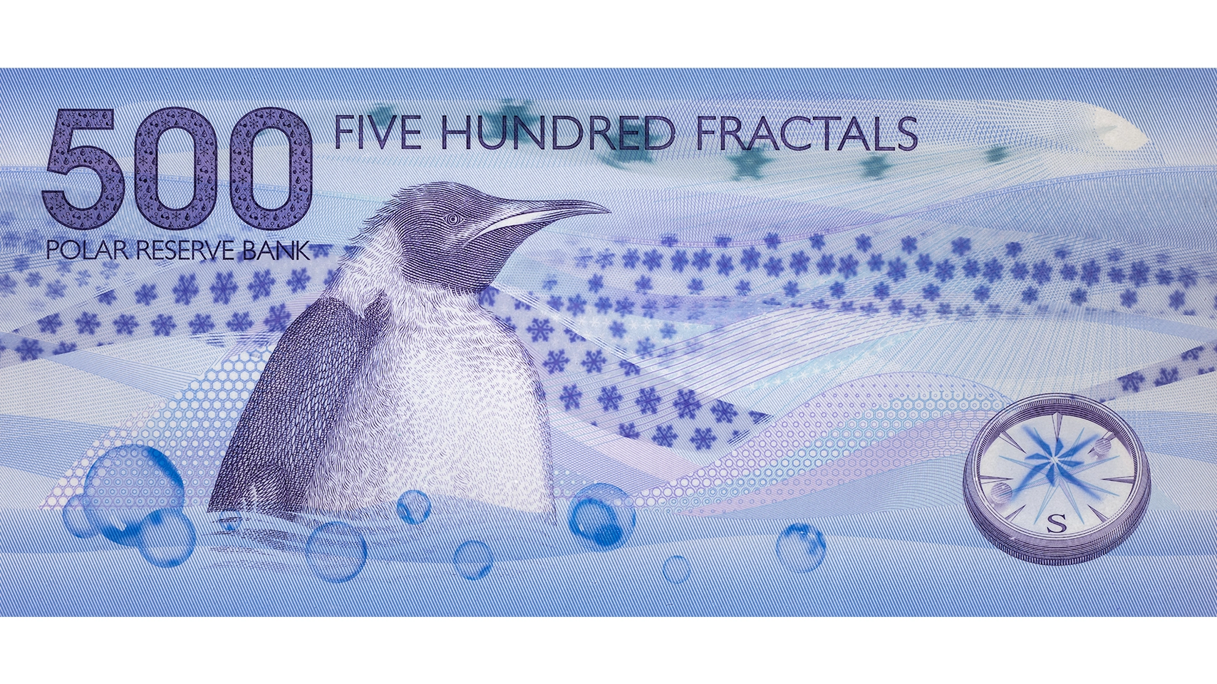 Leveraging the micro-optic technology behind the security features MOTION®, RAPID® and MOTION SURFACE®, the Crane Design Team created a fully micro-optic banknote integrating all three technologies. The front of banknote features the South Pole. The team brought depth to the flat space of the banknote with Topo effects that bulge out from the note surface with an apex of up to 10mm above the note. In the plane of the banknote itself, there is a micro-optic-propelled compass effect integrated with offset and intaglio printing. Tilting the note towards and away from you ‘blows’ snow from side-to-side; and tilting the note left and right sends the snowflakes rotating in place.